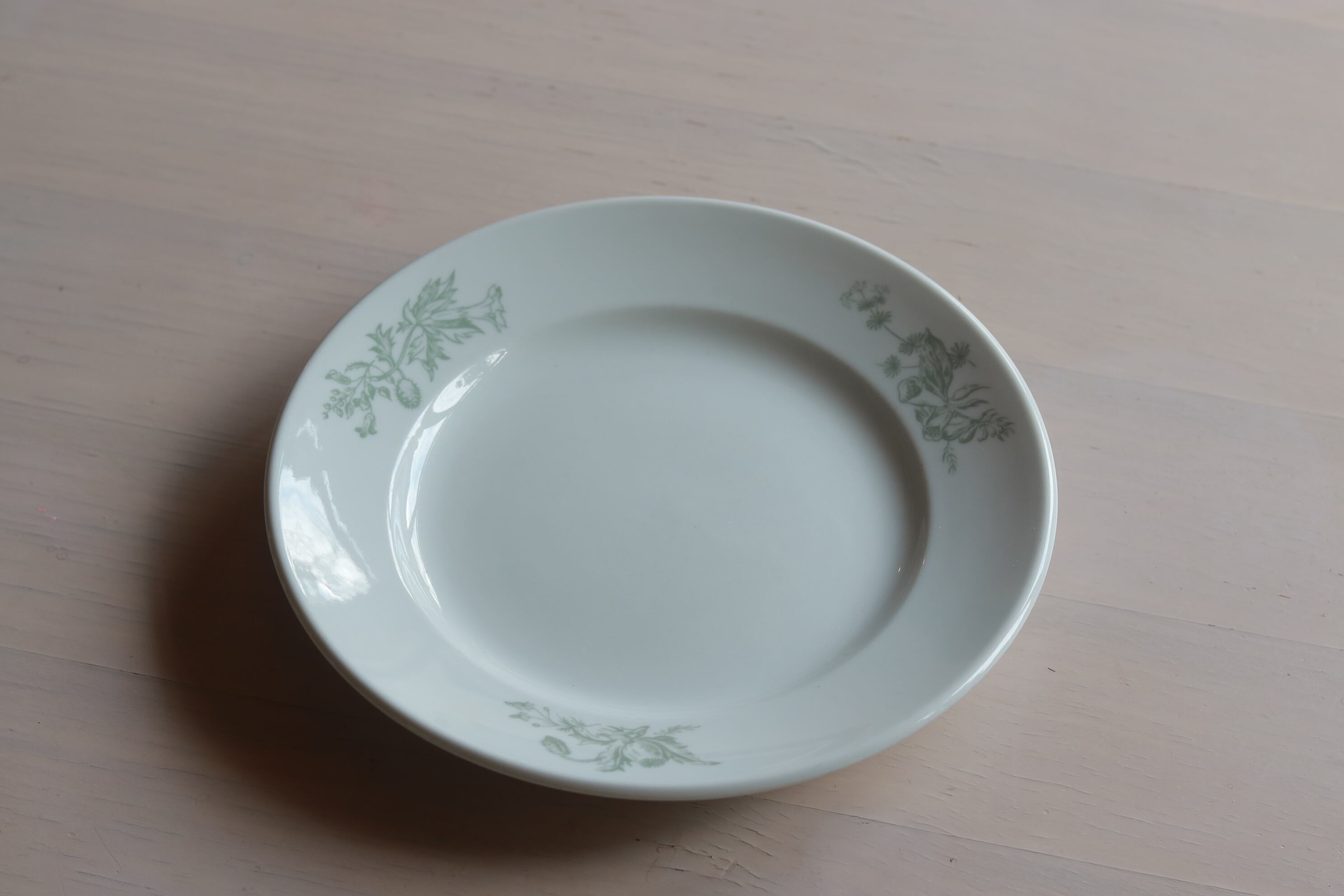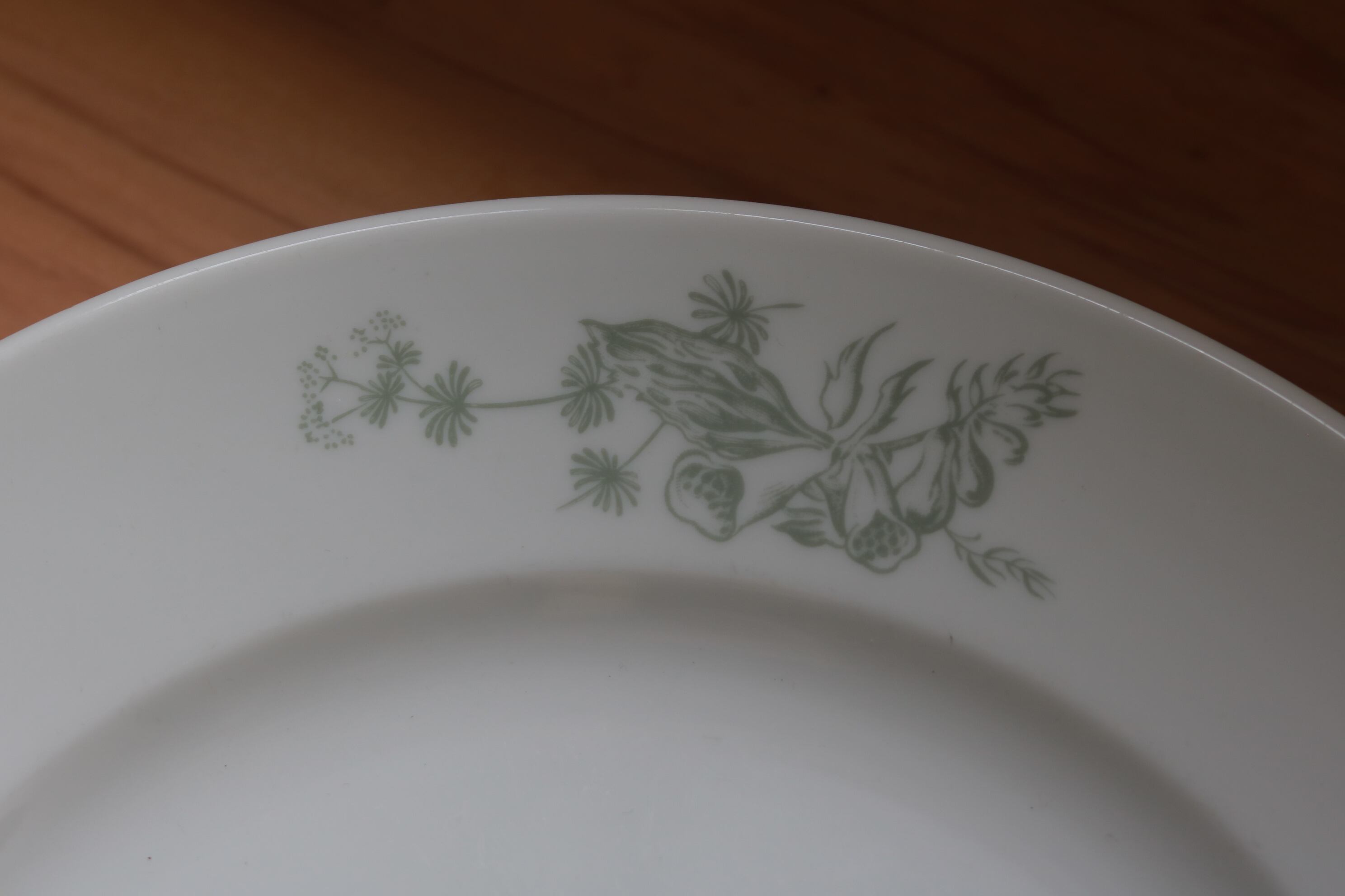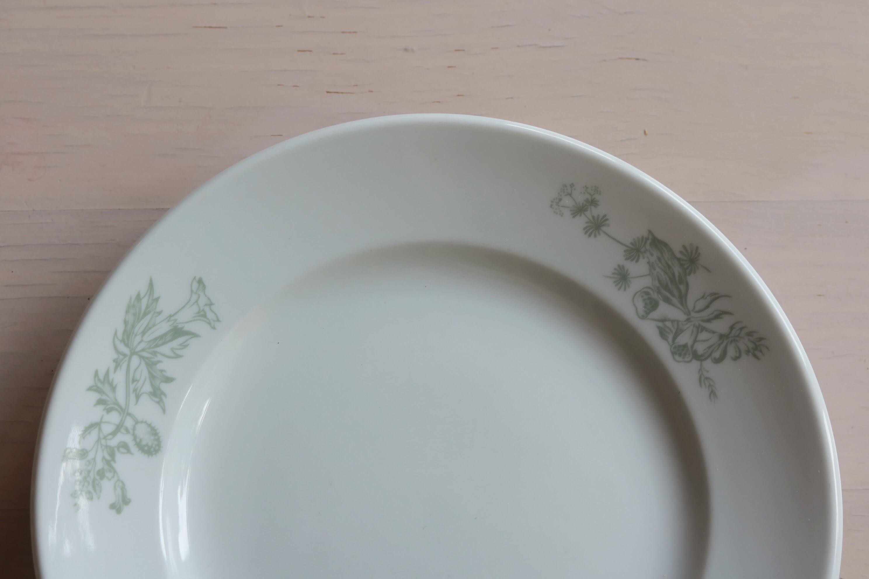 白地の陶器、縁に薄緑色で植物がペイントされています。