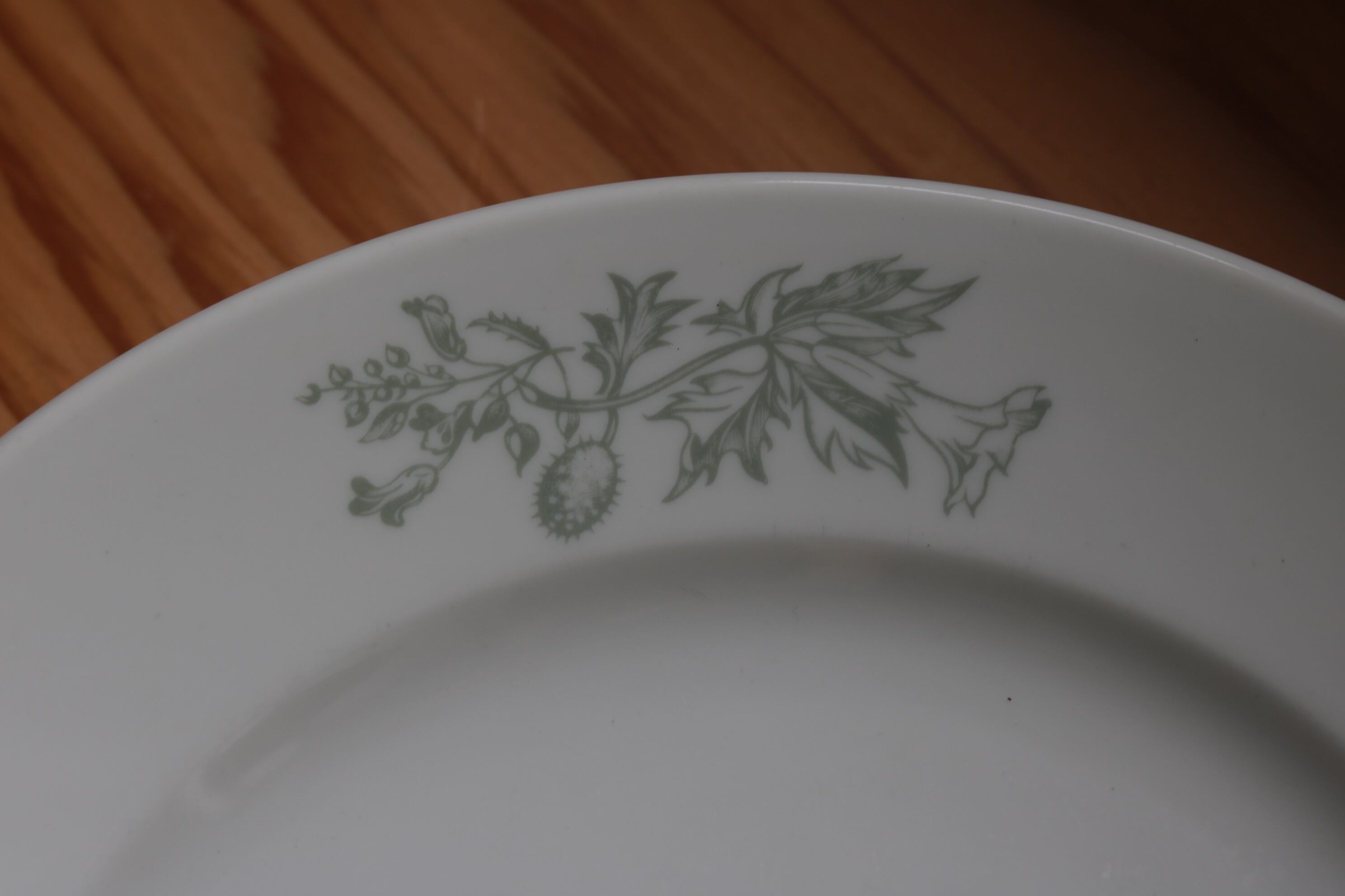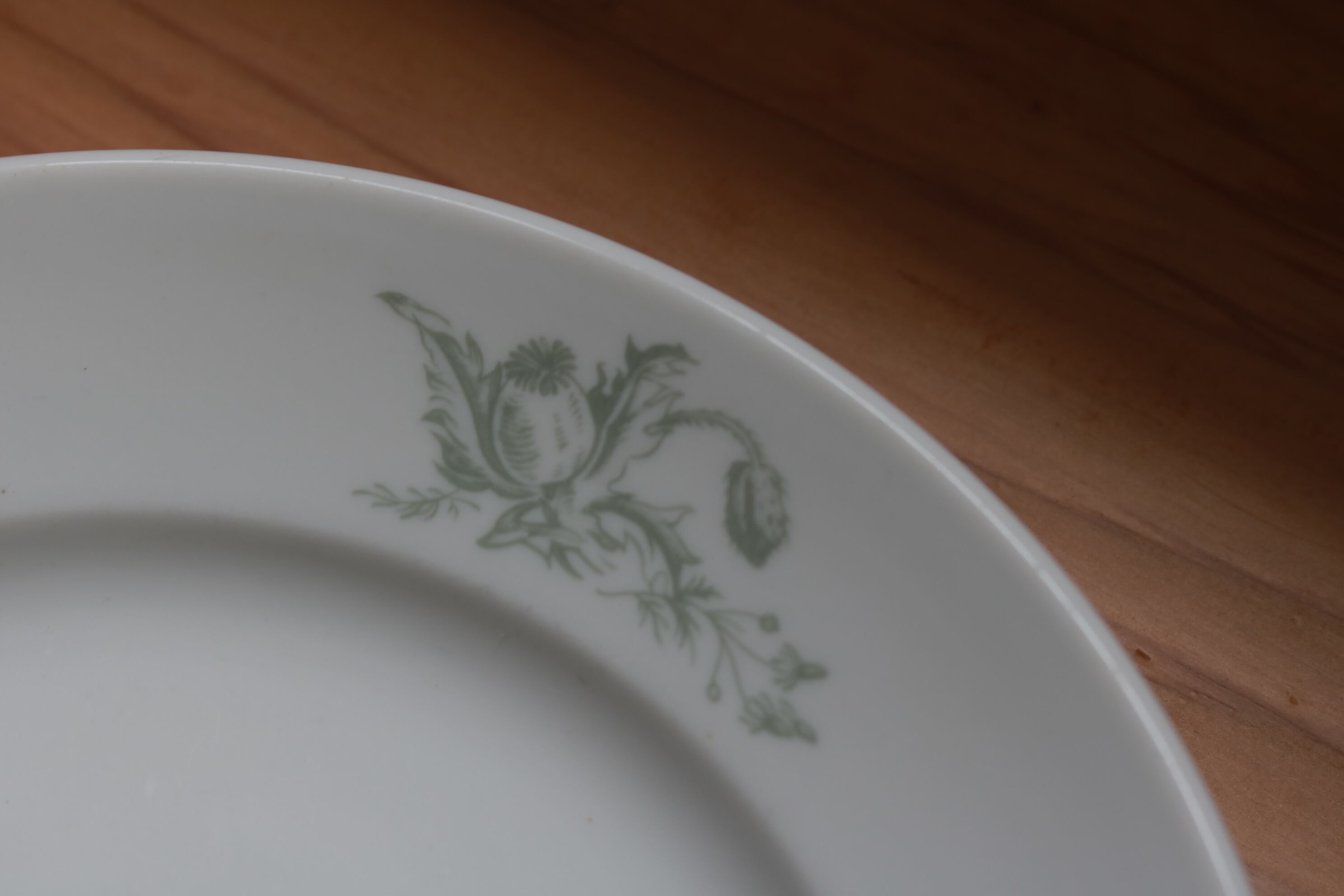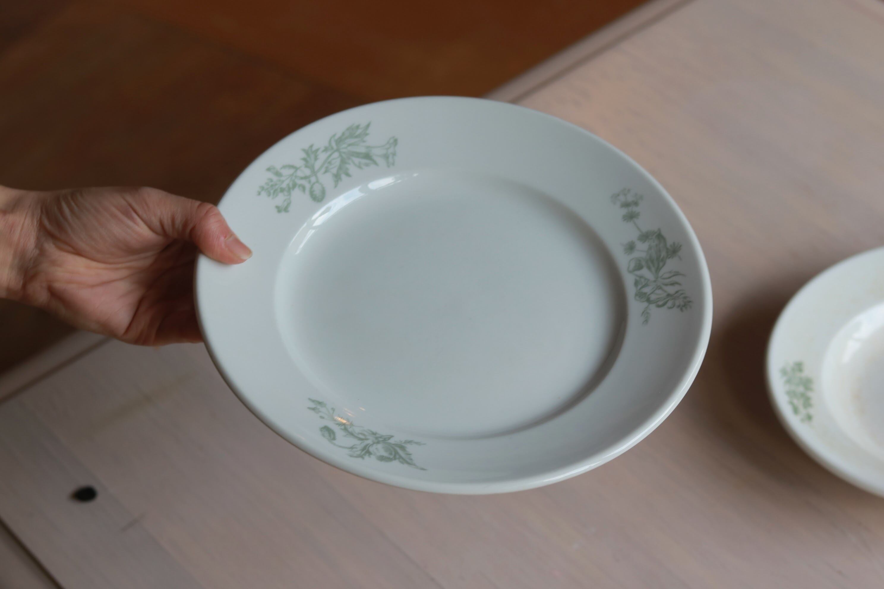 白地の陶器、縁に薄緑色で植物がペイントされています。
