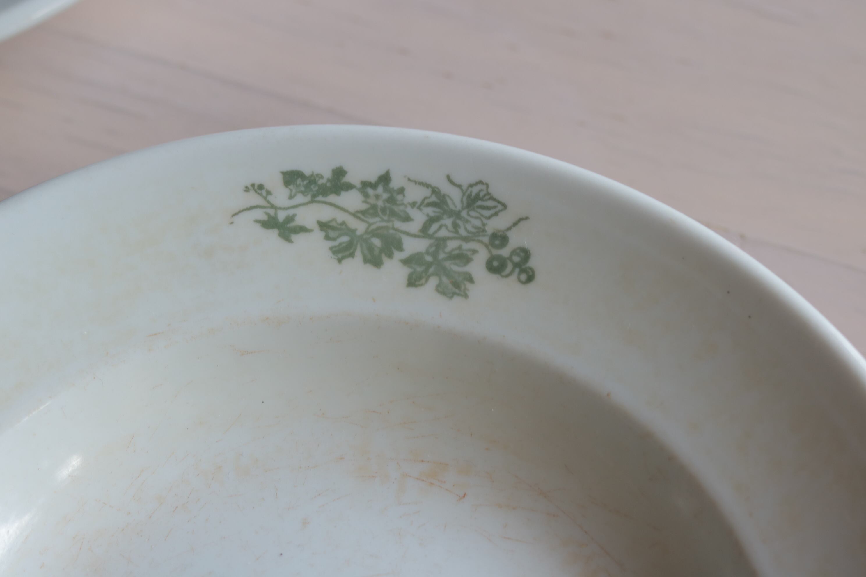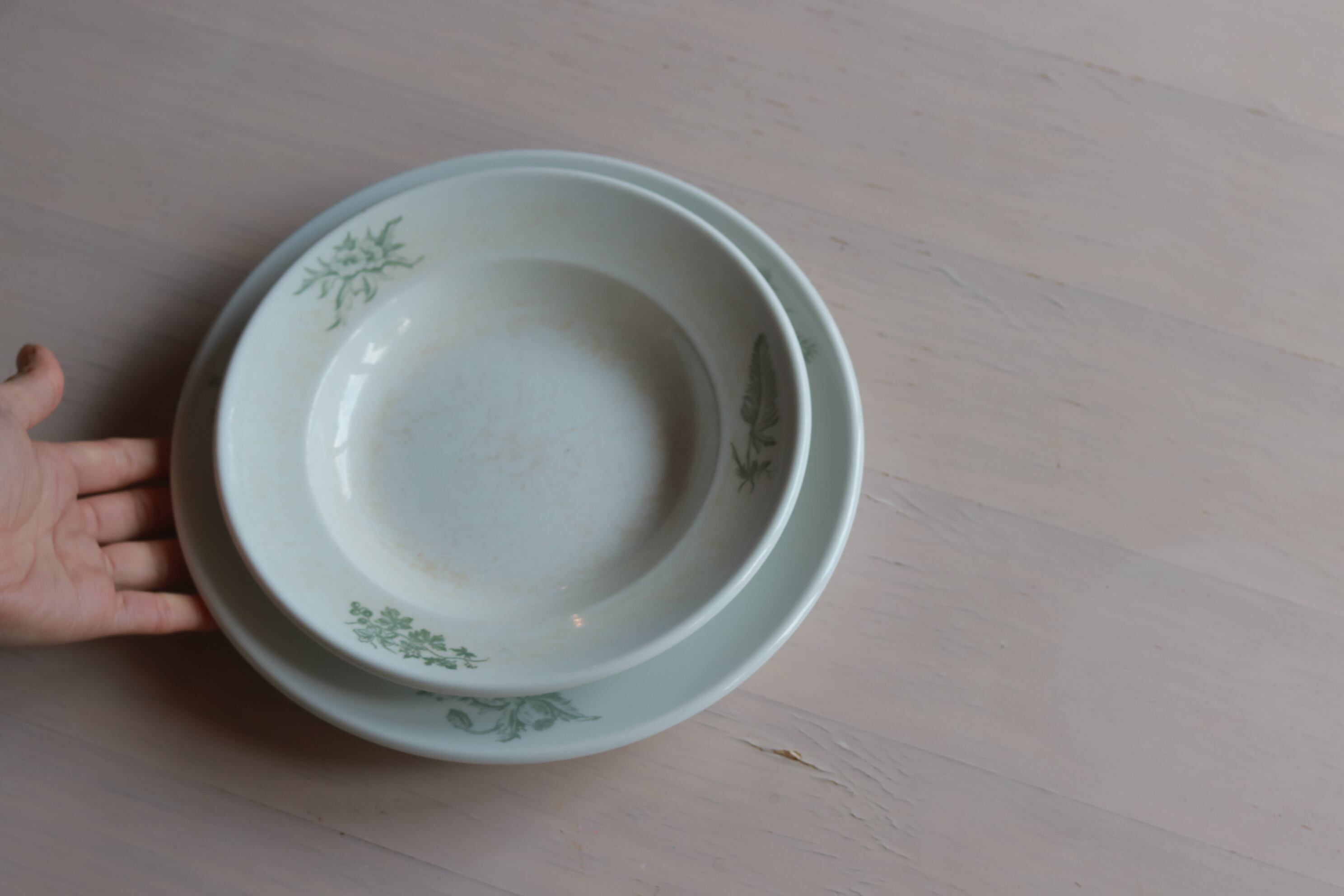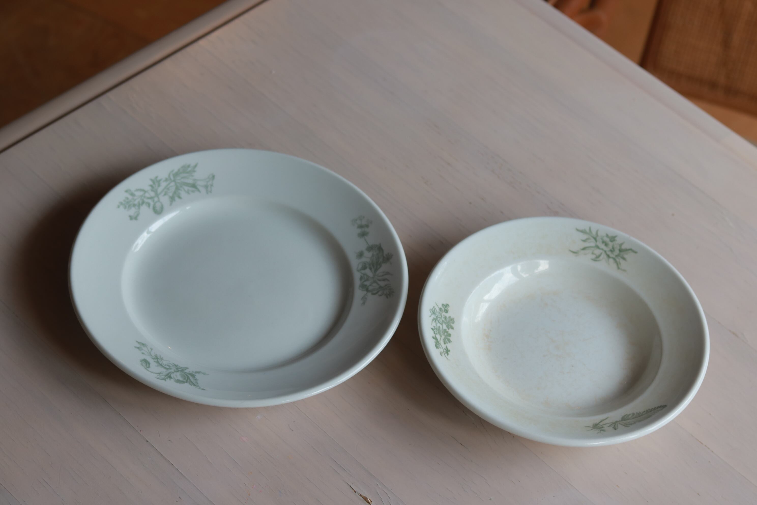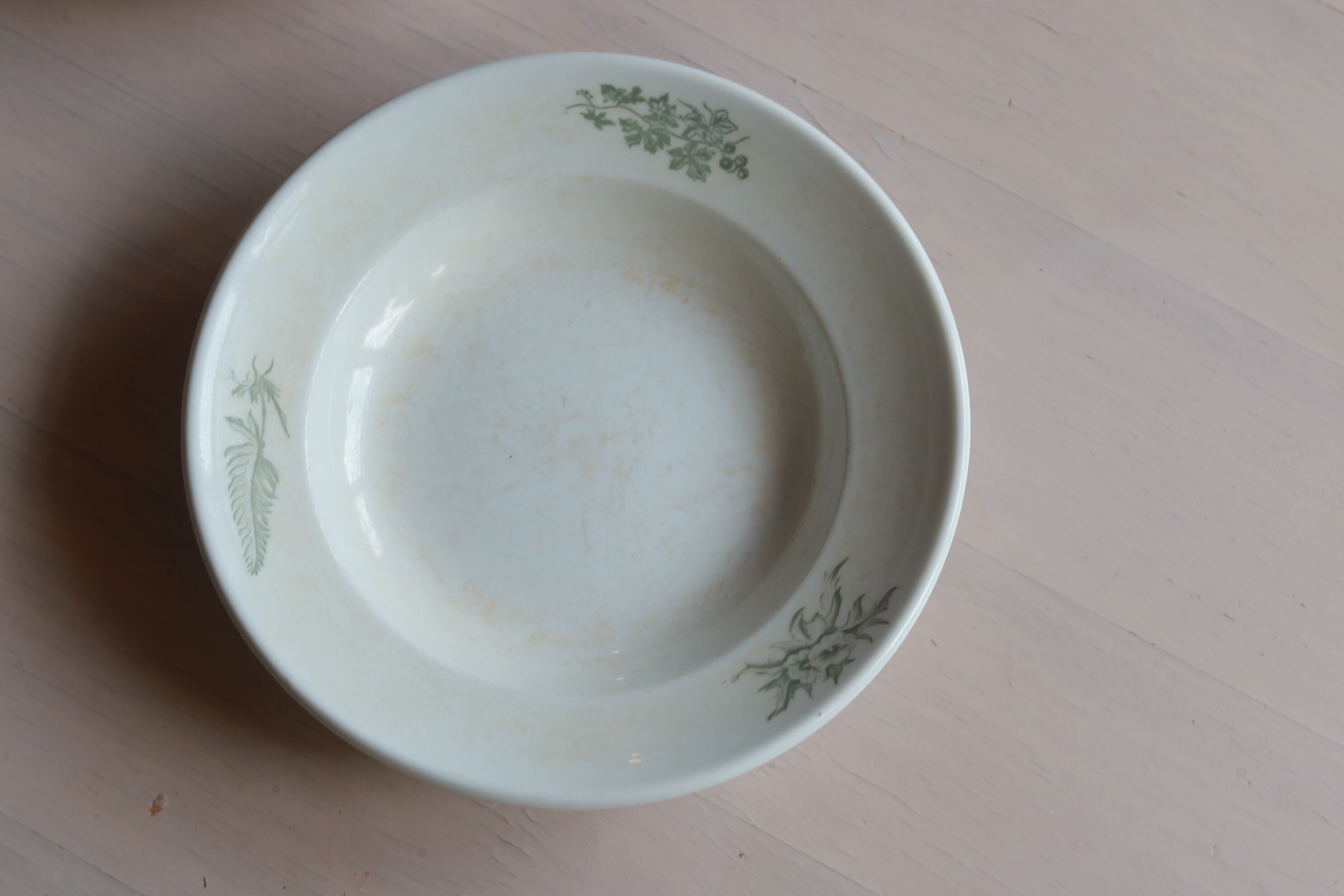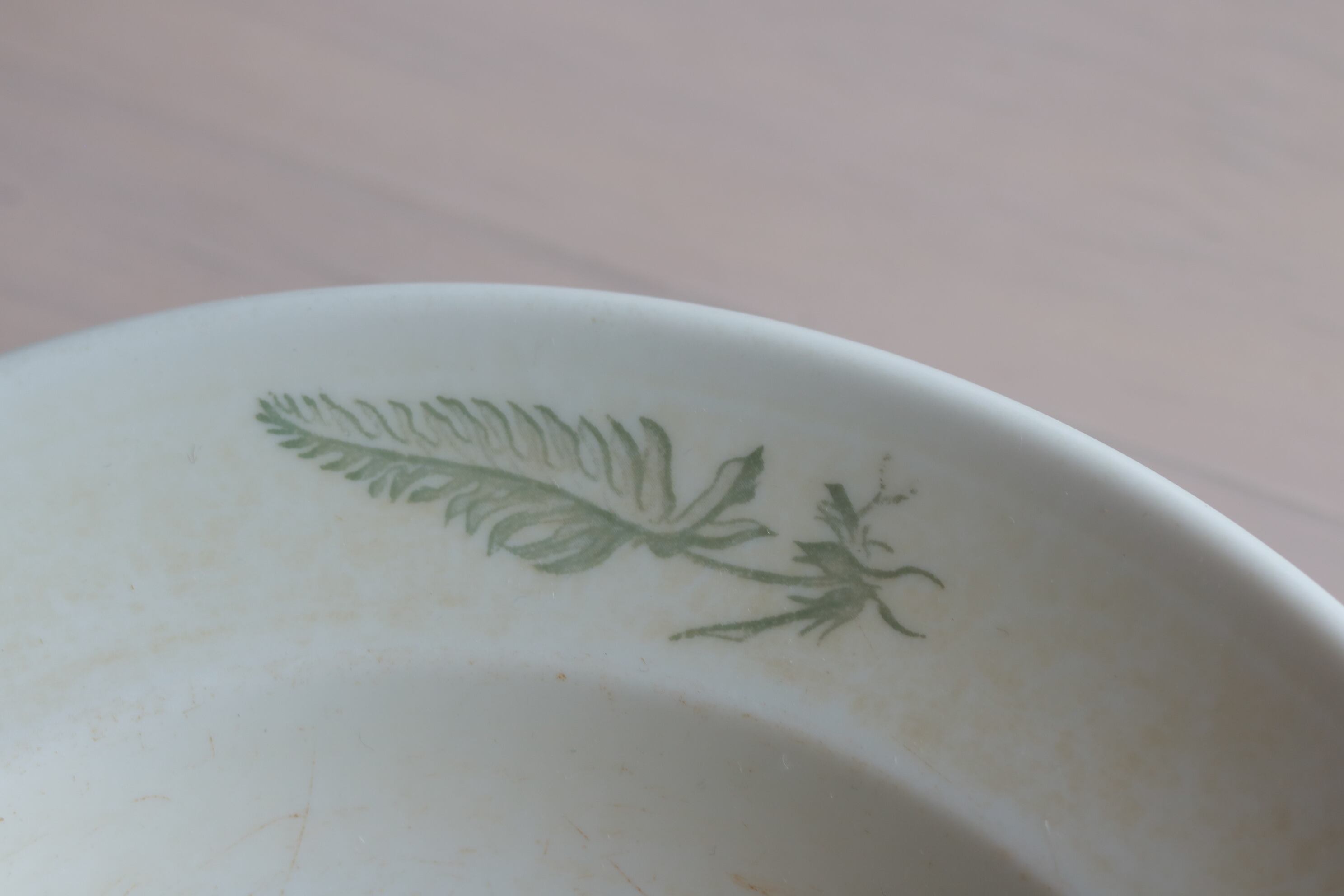 白地の陶器、縁に薄緑色で植物がペイントされています。