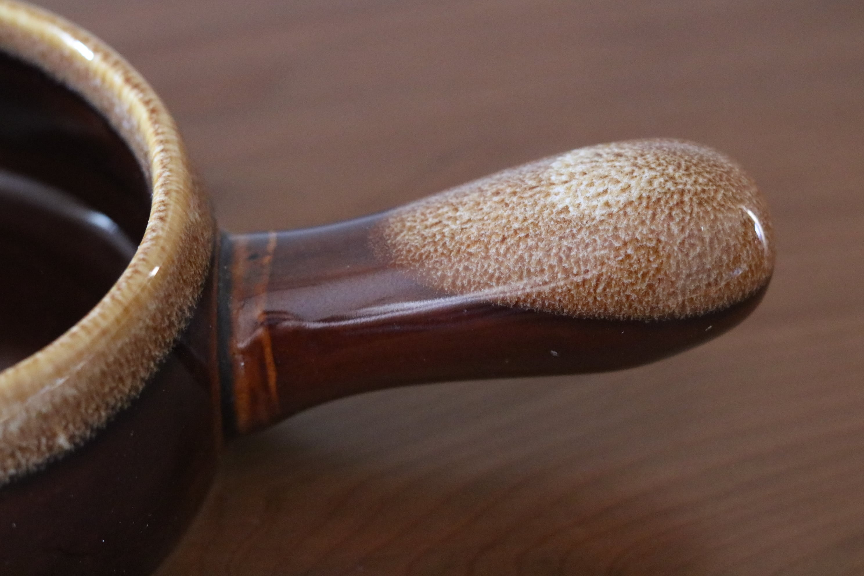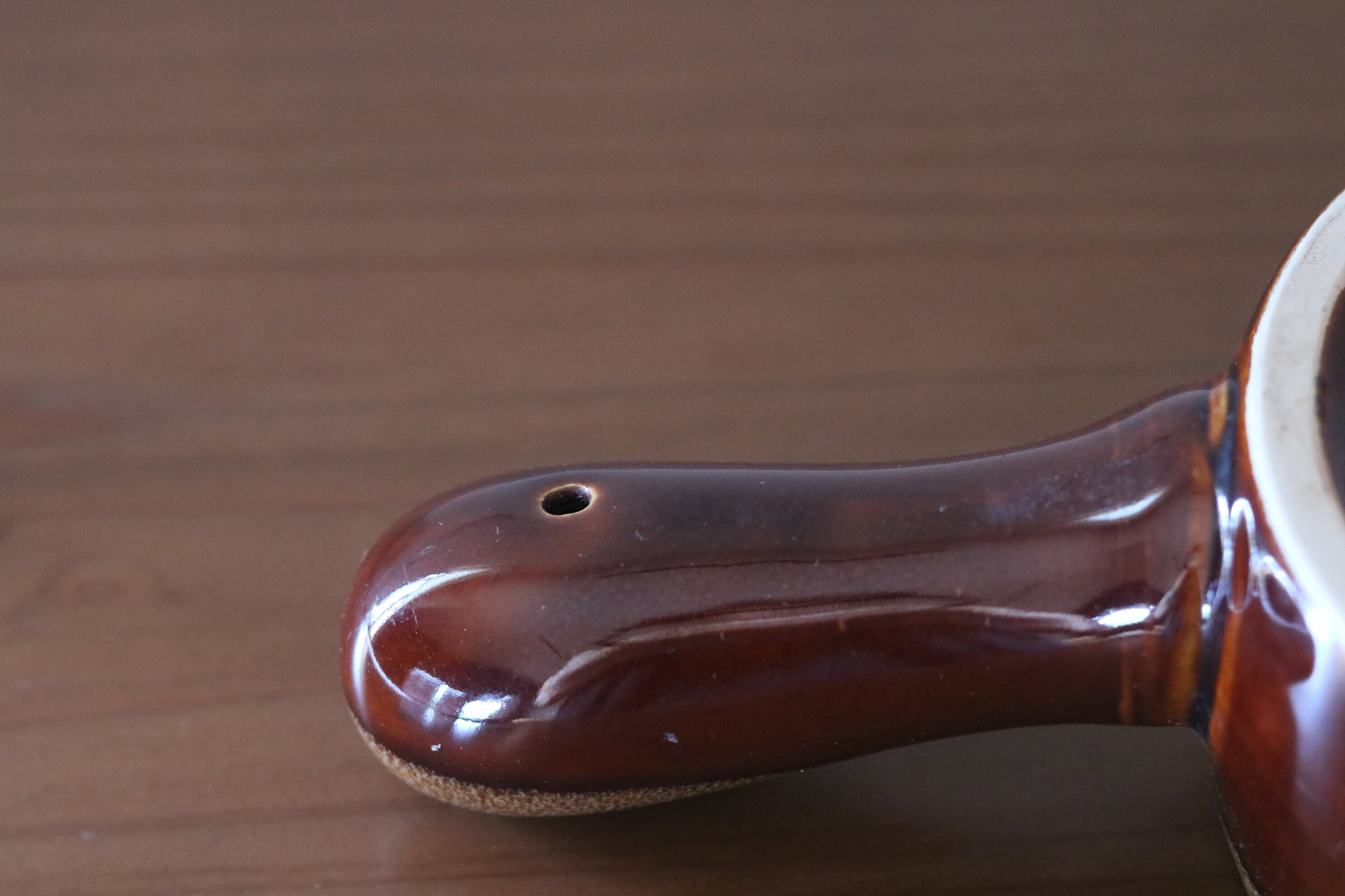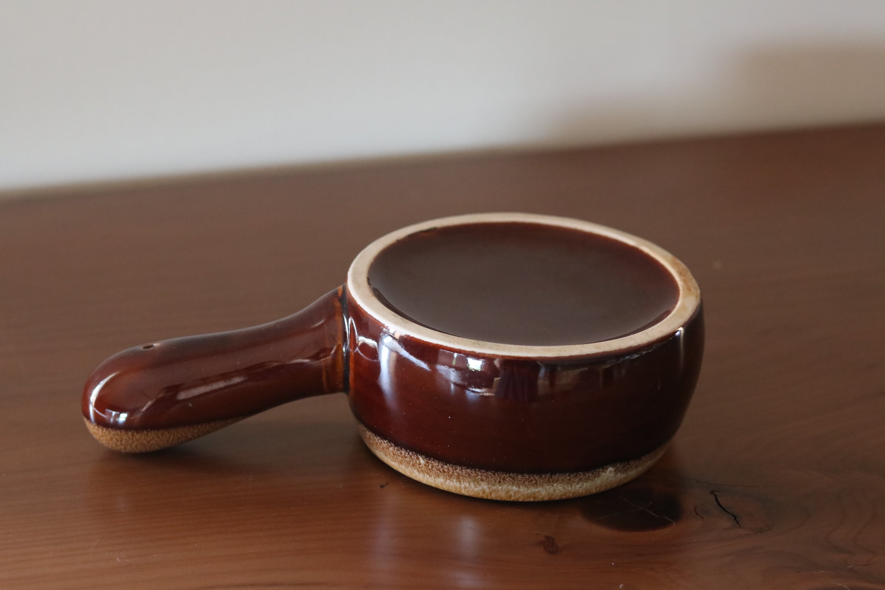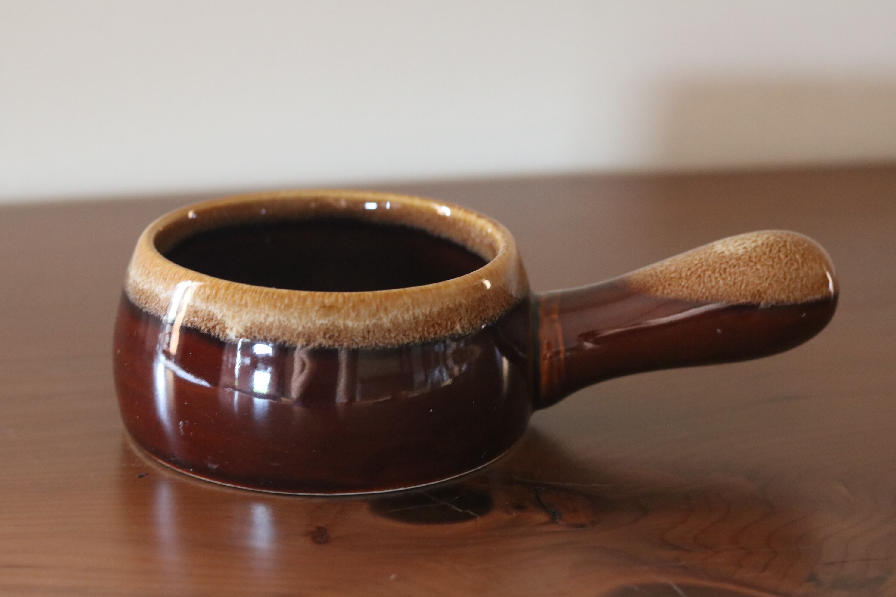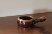 陶器製の小鍋です。飴色がかった艶のあるデザインです。