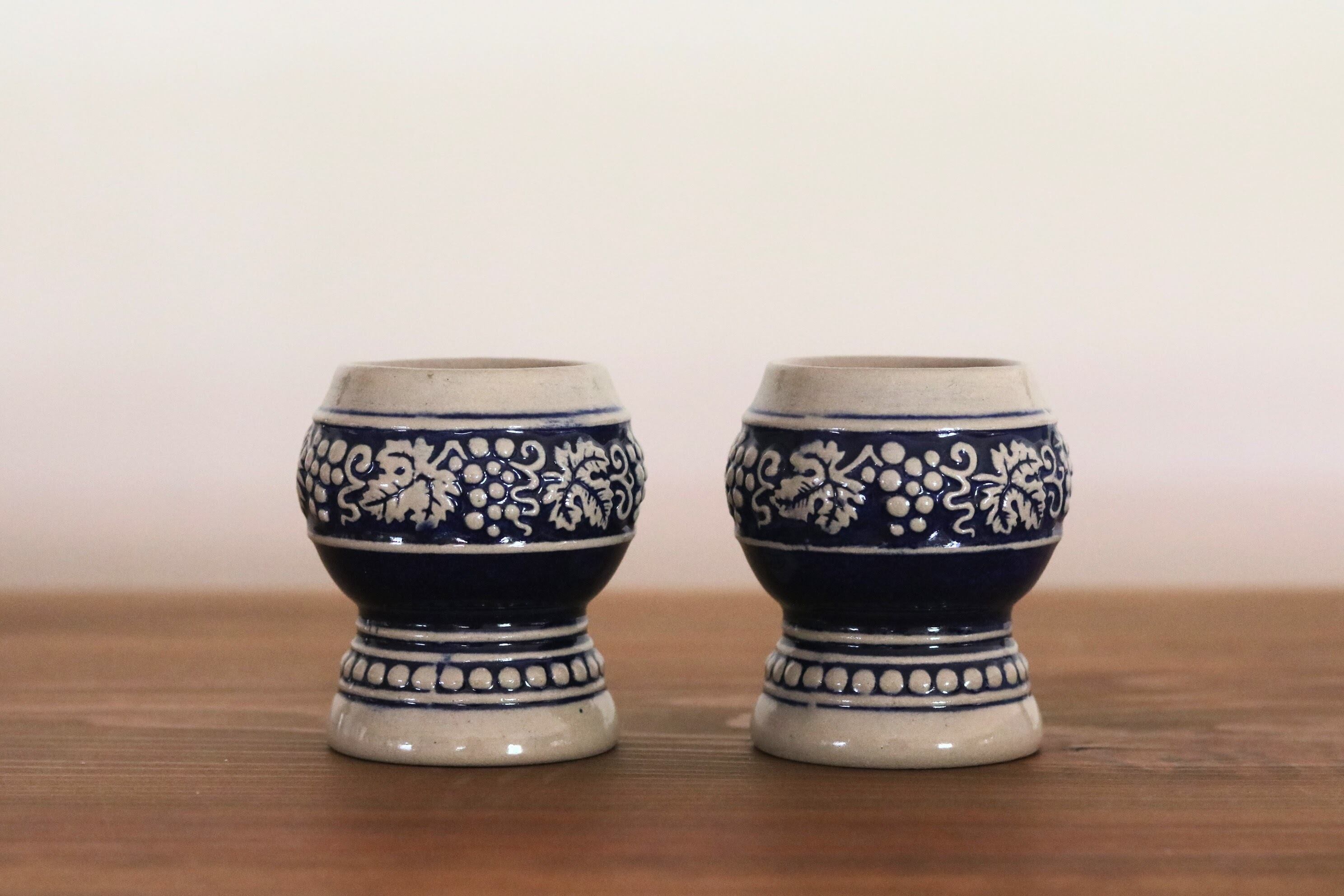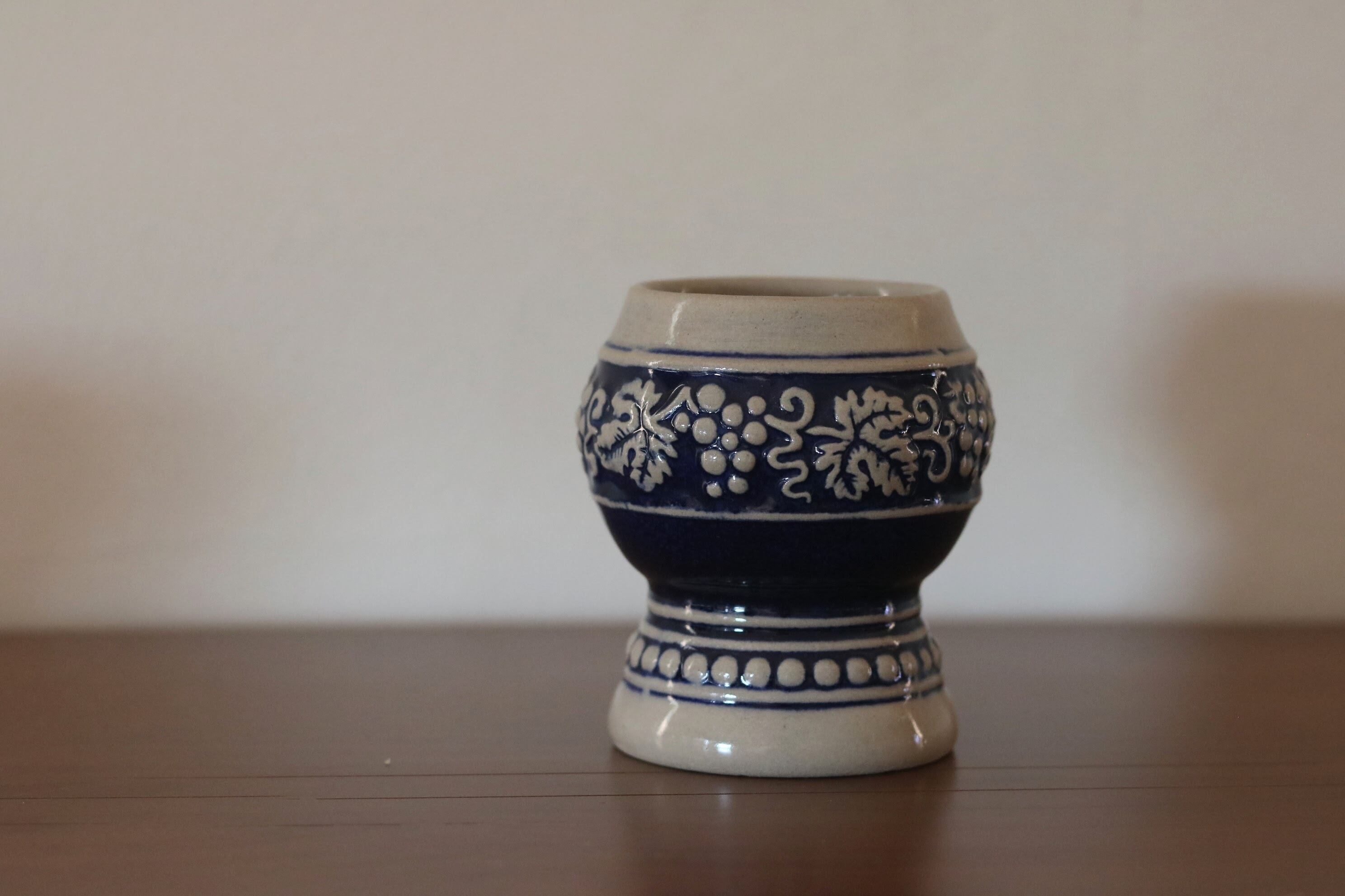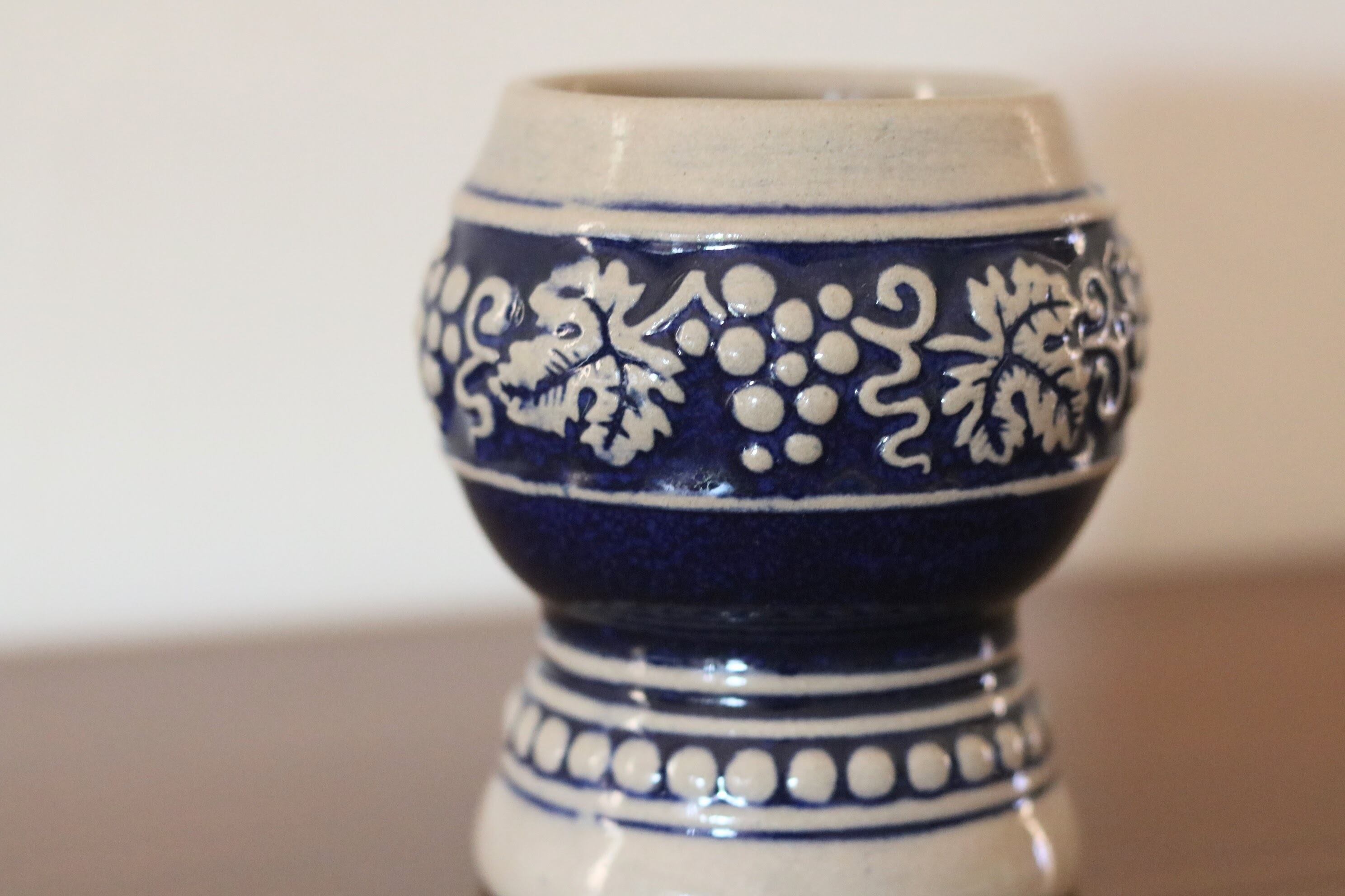 伝統的なグレーの陶器に濃いブルーのペイント、白地でブドウが描かれています。