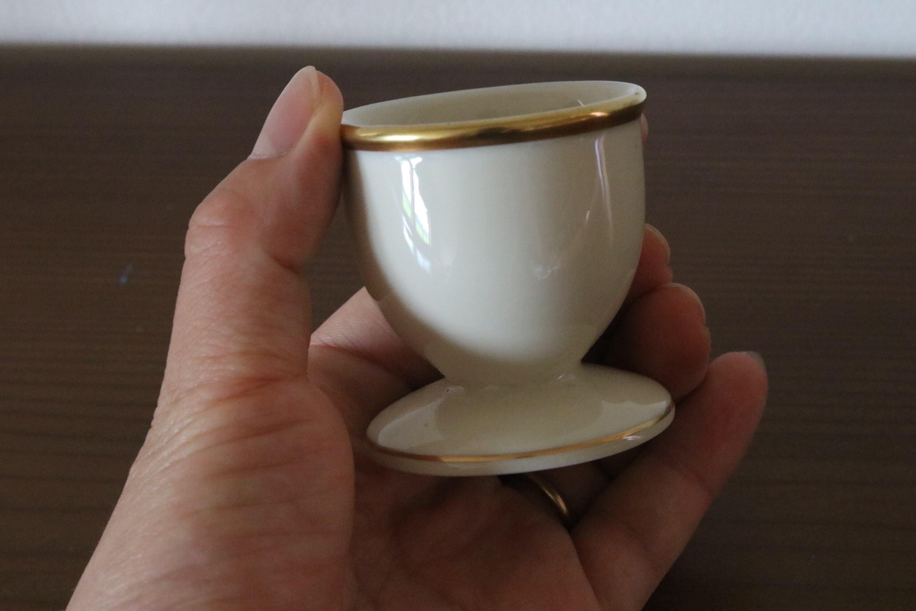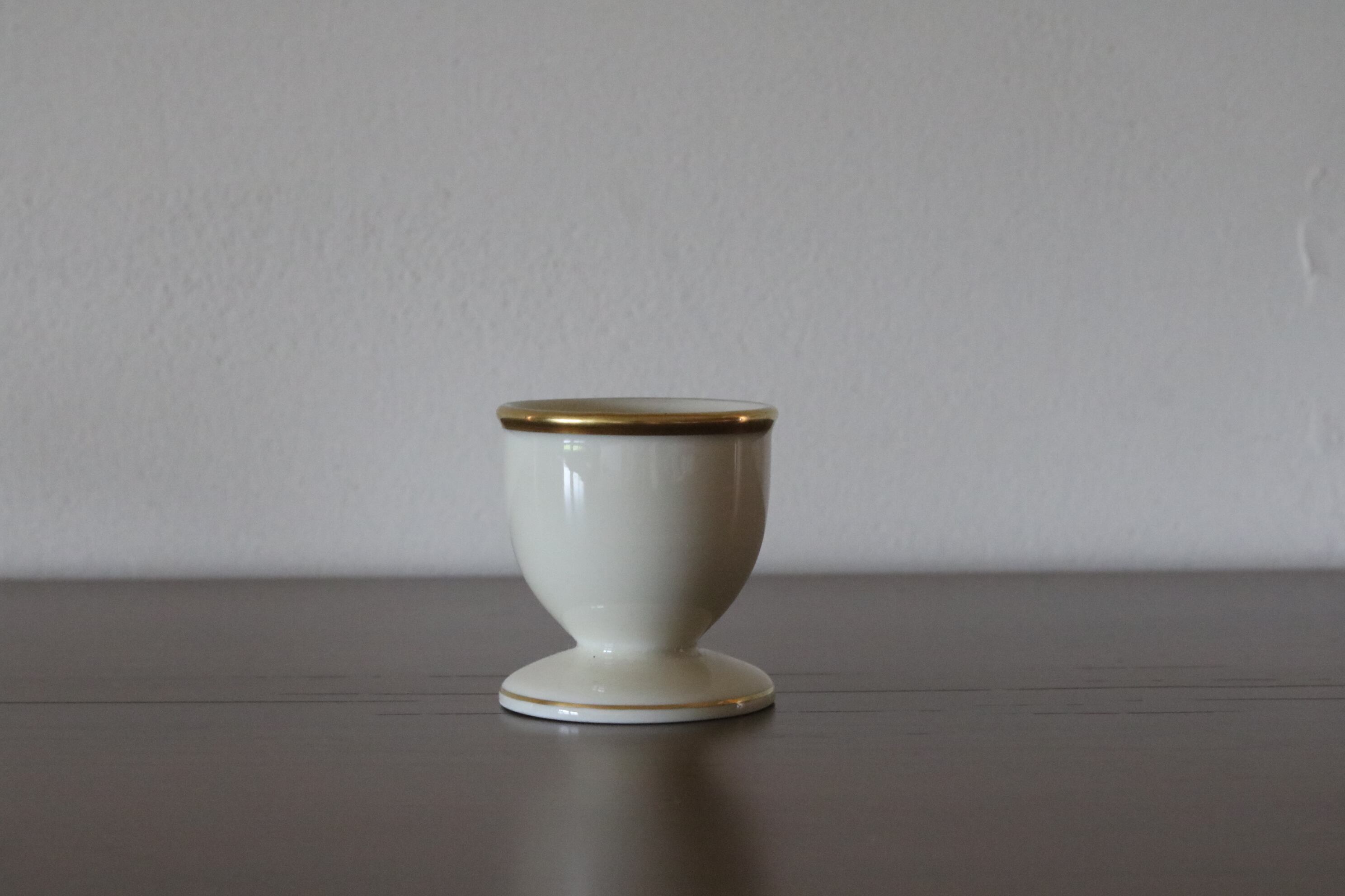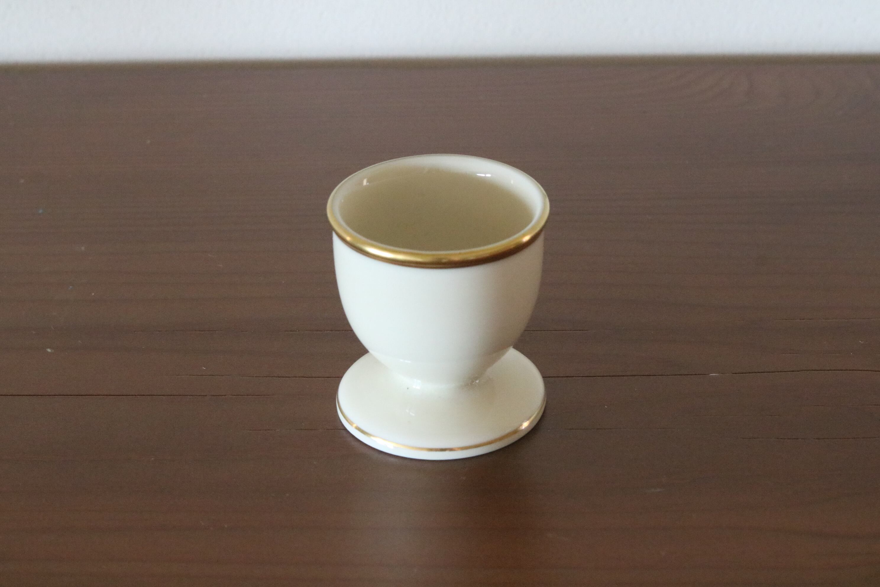 白い陶磁器のエッグスタンド、淵にゴールドのラインがあしらってあります。