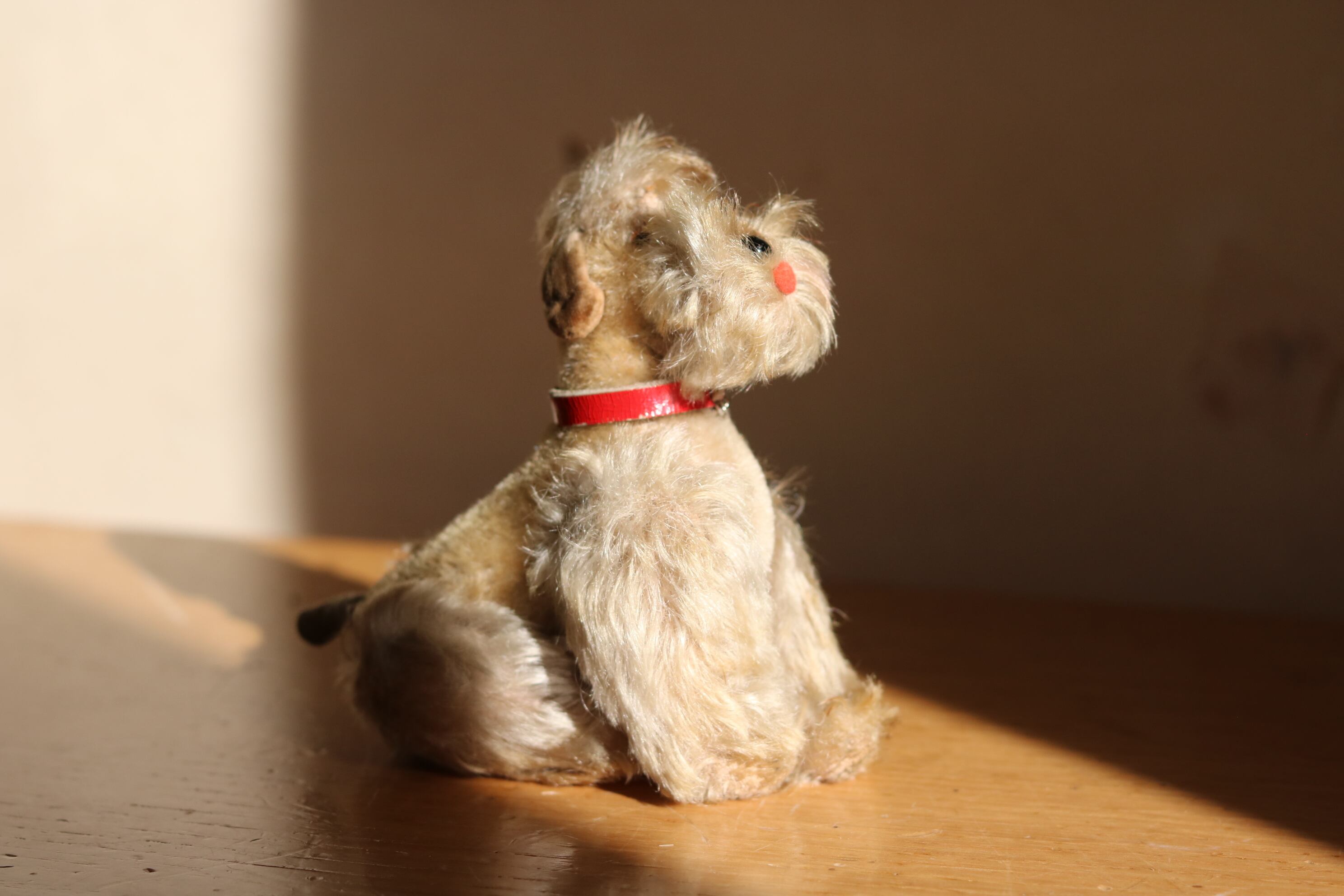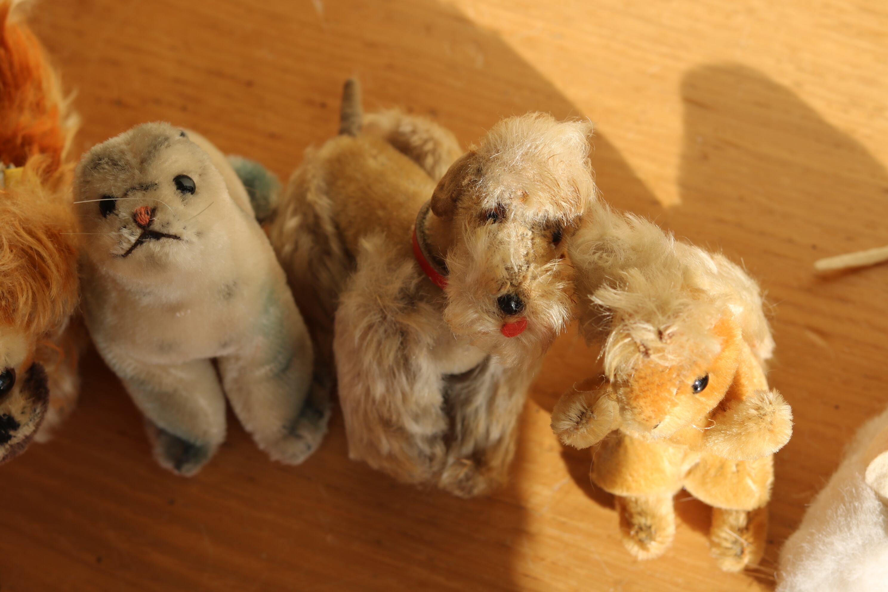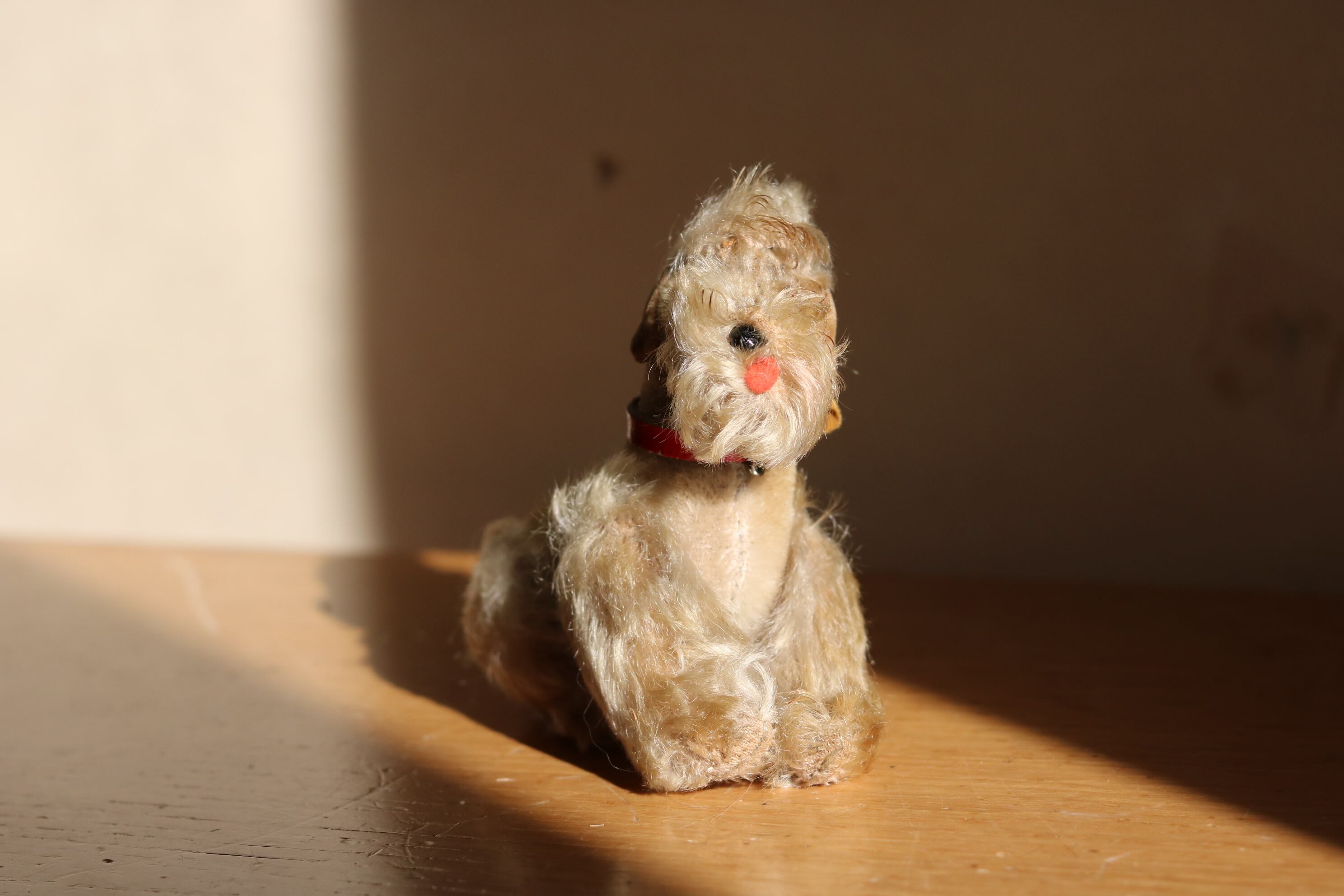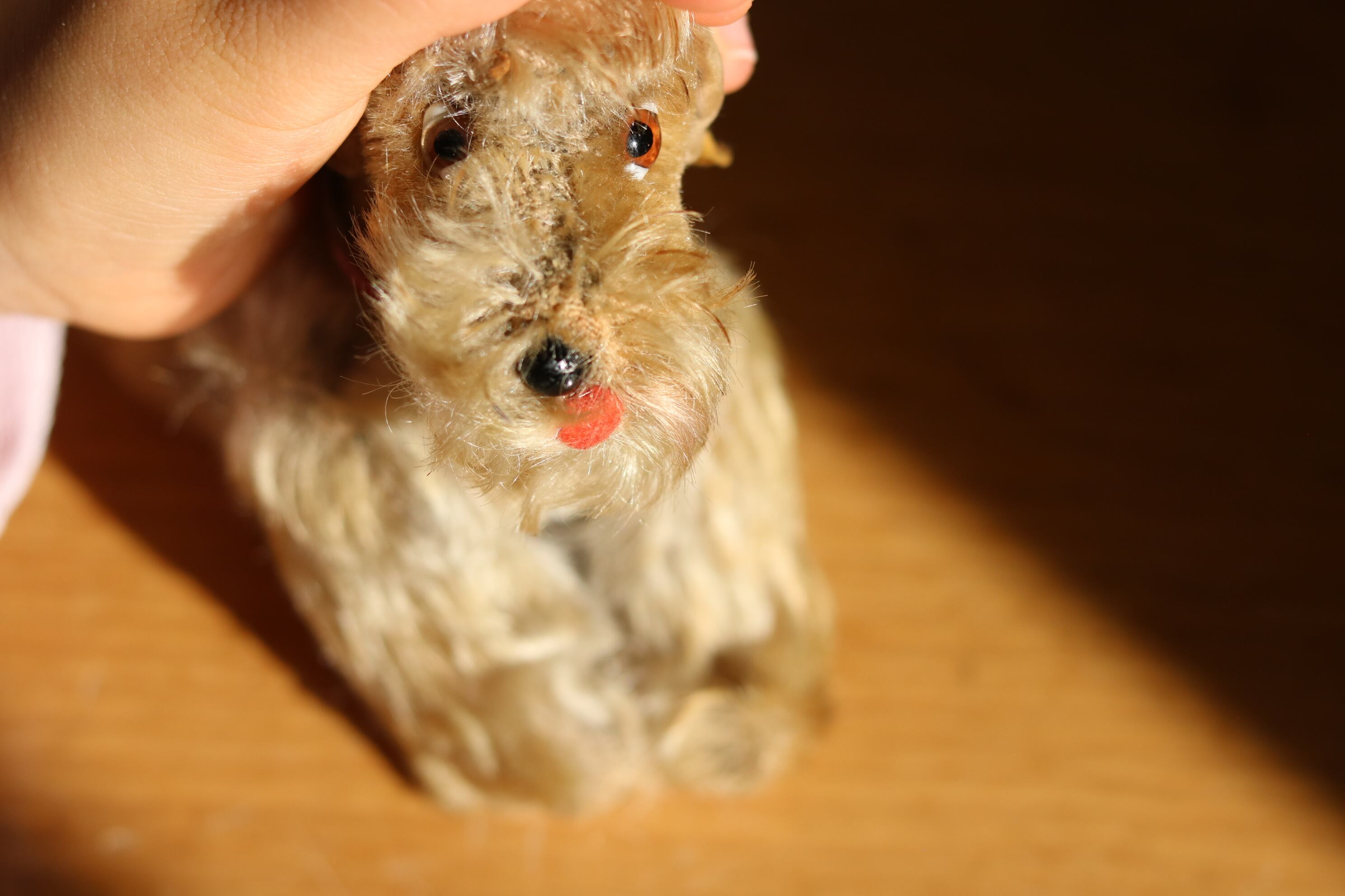 顔回りの毛がふさふさで目が隠れているのもご愛敬、そして何より小さな口(舌をだしているようにも見える)がなんとも言えないキュートさ。足四本違う方向に動かせます。お座りしてくれますが、ちょっと苦手で時々こてっと倒れます。